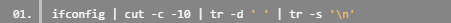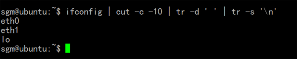 说明:ifconfig 输出的第一列的前十个字节显示的网络接口名,因此我们用 cut 命令提取每一行的前10个字符。