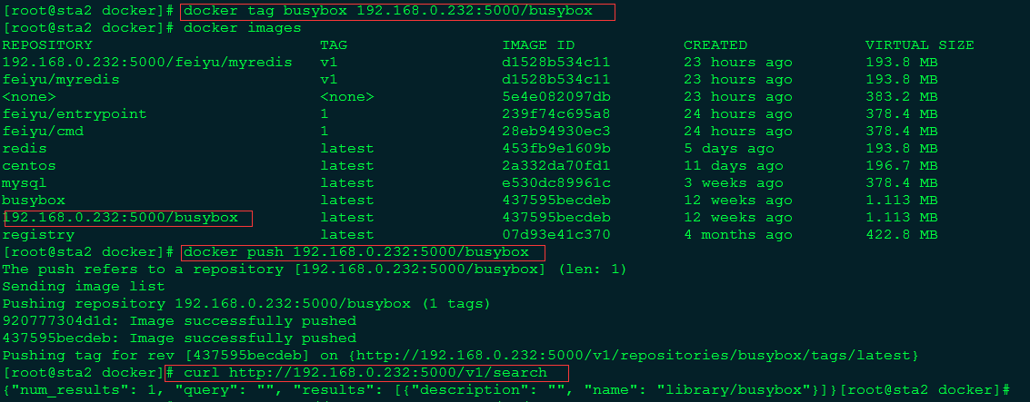 [root@sta docker]# docker pull 192.168.0.232:5000/busybox Pulling repository 192.168.0.232:5000/busybox 437595becdeb: Download complete 437595becdeb: Pulling image (latest) from 192.168.0.232:5000/busybox Status: Image is up to date for 192.168.0.232:5000/busybox:latest