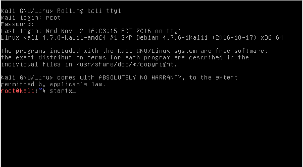 在安装过程中,安装程序将提示用户输入用来登录的“root”用户和密码。 一旦登录到 Kali Linux 机器,使用命令startx就可以启动 Enlightenment 桌面环境 - 值得注意的是 nmap 不需要运行桌面环境。