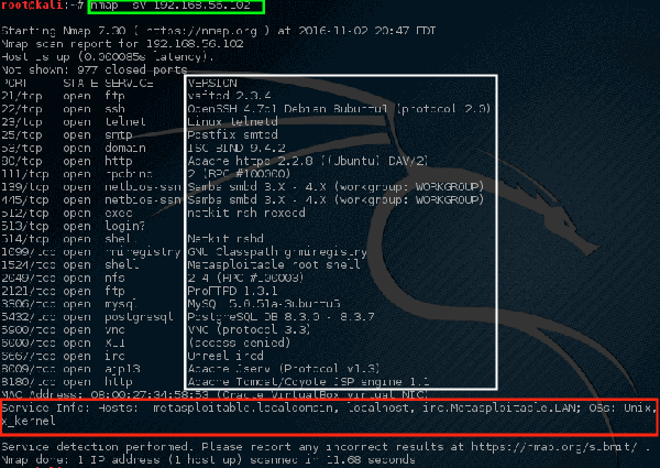 请注意这次 nmap 提供了一些关于 nmap 在特定端口运行的建议(在白框中突出显示),而且 nmap 也试图确认运行在这台机器上的这个操作系统的信息和它的主机名(也非常成功!)。
