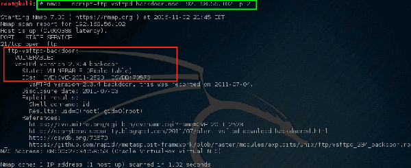 注意 nmap 已有一个 NSE 脚本已经用来处理 VSftpd 后门问题!让我们尝试对这个主机运行这个脚本,看看会发生什么,但首先知道如何使用脚本可能是很重要的。