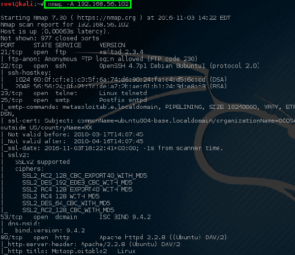 这些端口全都代表着在此特定机器上的某种监听服务。 我们前面说过,192.168.56.102 的 IP 地址会分配给一台易受攻击的机器,这就是为什么在这个主机上会有这么多开放端口。