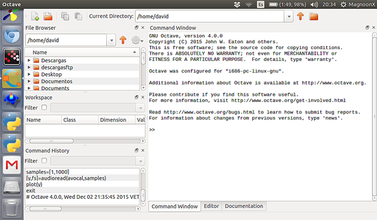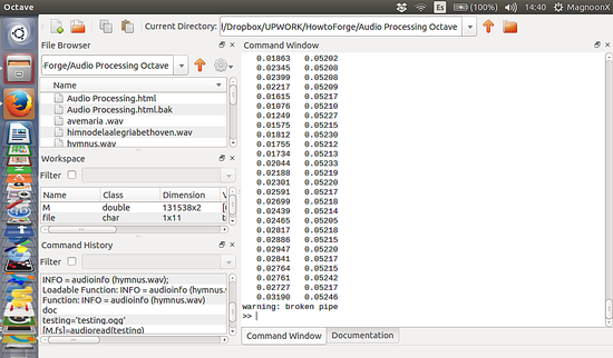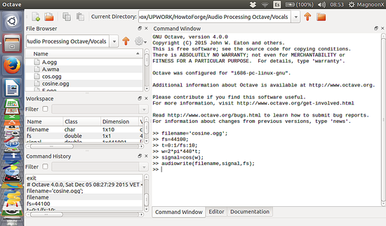 在本教程中我会使用 ogg 文件来读取这种文件的属性,比如采样、音频类型(stereo 和 mono)、信道数量等。必须声明的一点是教程中使用的所有的命令都是在 Octave 终端窗口中执行的。首先,我们必须要把这个 ogg 文件赋给一个变量。注意:文件必须在 Octave 的工作路径中。