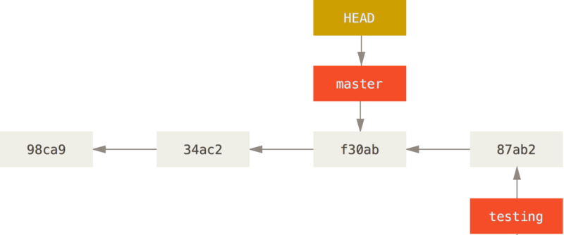 正如你所见,当前 “master” 和 “testing” 分支均指向校验和以?f30ab?开头的提交对象。