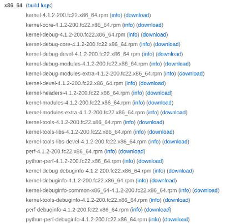 查看为Fedora构建的最新内核列表。从列表中选择最新的稳定版,然后向下翻到i686或x86_64版本,这取决于你系统的架构。在这个部分,你需要下载下列文件,并保存到各自的文件夹下(比如Downloads文件夹下的“Kernel”):