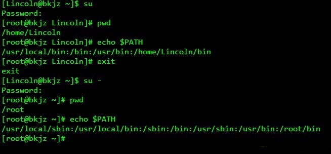 su命令和su -命令最大的本质区别就是:前者只是切换了root身份,但Shell环境仍然是普通用户的Shell;而后者连用户和Shell环境一起切换成root身份了。只有切换了Shell环境才不会出现PATH环境变量错误。su切换成root用户以后,pwd一下,发现工作目录仍然是普通用户的工作目录;而用su -命令切换以后,工作目录变成root的工作目录了。用echo $PATH命令看一下su和su -以后的环境变量有何不同。以此类推,要从当前用户切换到其它用户也一样,应该使用su -命令。