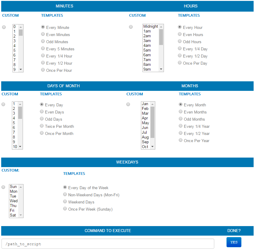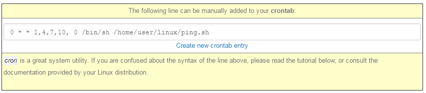 如上图所示,用户可以自定义min/hour/day/month/week或采用他的模板进行设定,在最后同时会让你输入你要执行的脚本(命令),这里我们始终建议大家使用绝对路径来避免定时任务不生效。点击“YES”后会生成如下图所示的结果,然后添加到crontab文件中即可。