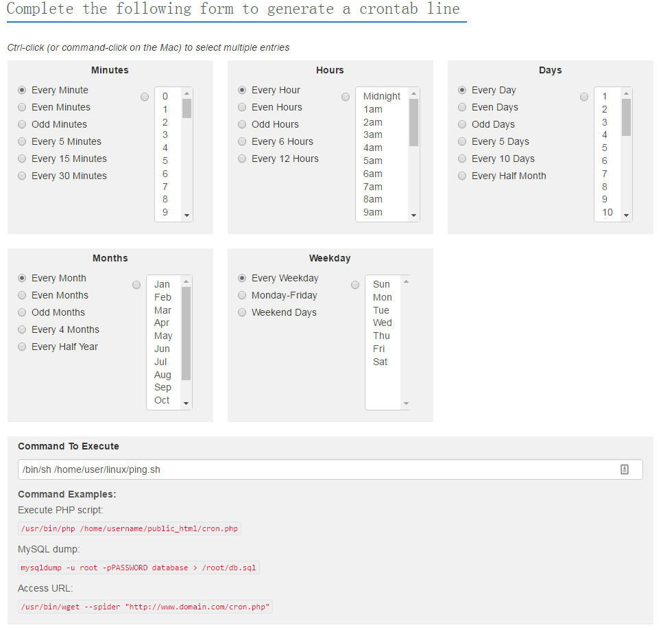 这个网站可以专门提供一些在线的定时任务,同时也可以生成crontab的配置文件,生成的配置可以选择导出到文件、也可以直接输出到屏幕上。