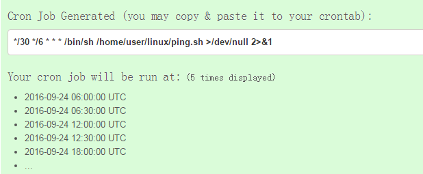 这个生成的配置比较人性化的将结果重定向到了/dev/null中,避免了频繁发送日志文件。同时显示出了下5次的任务执行时间。