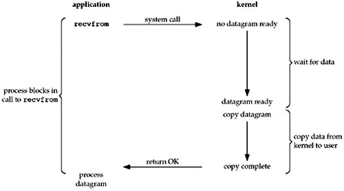 重点解释下上图,下面例子都会讲到。首先application调用 recvfrom()转入kernel,注意kernel有2个过程,wait for data和copy data from kernel to user。直到最后copy complete后,recvfrom()才返回。此过程一直是阻塞的。
