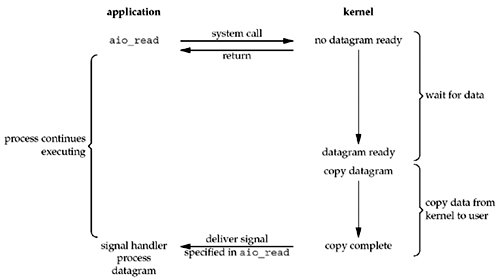 完全异步的I/O复用机制,因为纵观上面其它四种模型,至少都会在由kernel copy data to appliction时阻塞。而该模型是当copy完成后才通知application,可见是纯异步的。好像只有windows的完成端口是这个模型,效率也很出色。