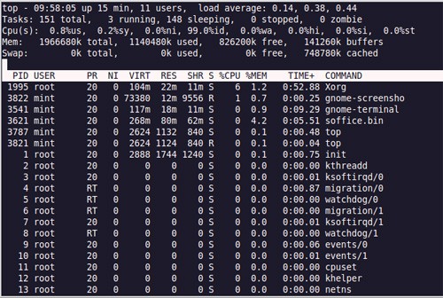 ‘top’是一个更加有用的命令,可以监视系统中不同的进程所使用的资源。它提供实时的系统状态信息。显示进程的数据包括PID、进程属主、优先级、%CPU、%memory等。可以使用这些显示指示出资源使用量。