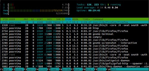 htop与top很类似,但是htop是交互式的文本模式的进程查看器。它通过文字图形化地显示每一个进程的CPU和内存使用量、swap使用量。使用上下光标键选择进程,F7和F8改变优先级,F9杀死进程。Htop不是系统默认安装的,所以需要额外安装。