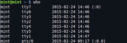 who是类似命令,提供当前登录用户列表、系统启动时间、运行级别等。