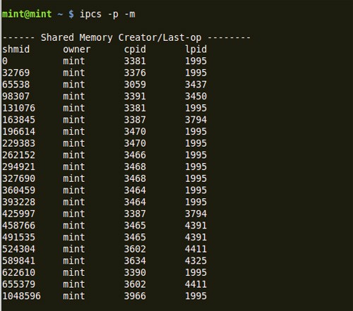 下面屏幕截图列出了最近访问了共享内存段的进程的创建者的ID和进程ID。