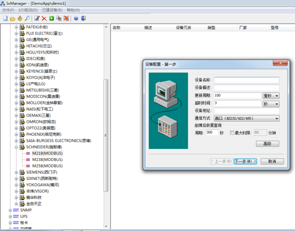 如果这个设备是个常规设备,比施耐德PLC,或者智能仪表、亚当模块,那么在力控组态软件中会有这个设备的驱动程序,硬件组态的时候直接选择这个设备即可。如下图所示:
