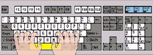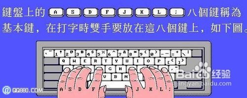 第一步、将手指放在键盘上(如下图,手指放在八个基本键上,两个母指轻放在空格键上)