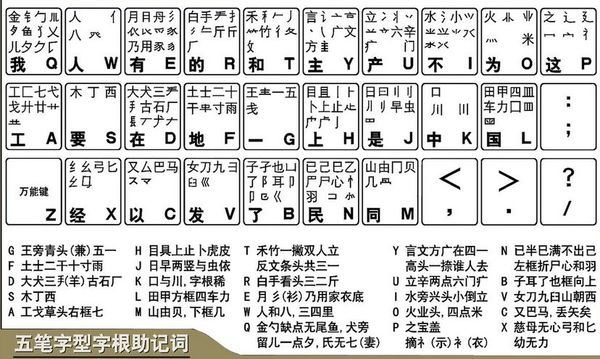 4、键名汉字:在键盘上每个字母键都有一个英文名称,如A键、B键等,在五笔输入法中,也给每个字母键对应的键起了一个中文名称,如“工”键对应A键,“大”键对应D键,所以总共有二十五个键名字。打法:连击两次键名字所在键后再加空格,如“大”=“大”+“大”+空格。