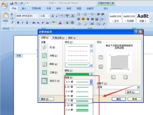 4、在“宽度”下拉列表中,选择不同横线宽度,来修改横线的粗细。