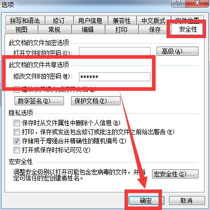 打开“选项”界面,点击“安全性”,在“修改文件时的密码”一栏里输入特定的密码,点击“确定”的按钮;