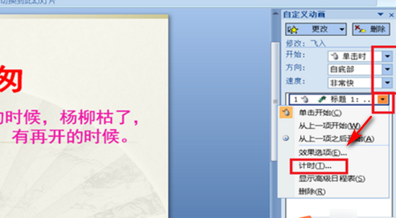 7、设置完成后,可以选中文字,在右侧进行修改,修改速度,出现形式,方向,是否计时等。