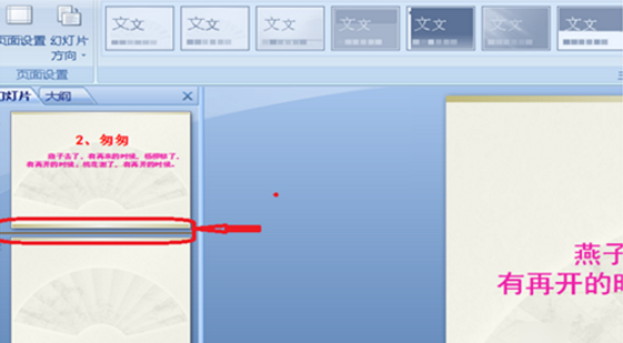 9、做完第一张幻灯片以后,可以把鼠标指向左侧的第一张幻灯片的下方,让光标闪动,单击回车键,单击一下,就增添了一张,依次类推,就可以做一个完整的课件了。