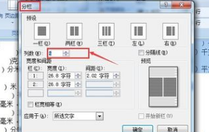 3、如果对“预设”选项组中的分栏格式不太满意,可以在“栏数”微调框中输入所要分割的栏数。微调框中最大分栏数根据纸张的不同而不同。