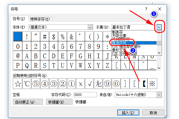 4、点击符号里面的子集右边的下拉箭头,然后在弹出的选项里面选择“其他符号”;