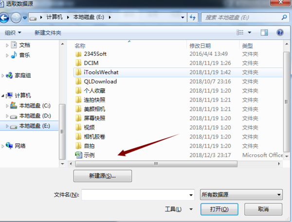 3、选择你要插入的数据源,即你要插入内容的EXCEL文档。选择点击打开。