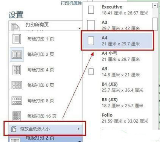 4、再次打开【每版打印几页】,滑至最下面,鼠标移到【缩放至纸张大小】上,在右侧找到A4。如果你的打印机用的不是A4,那就选择你的打印机实际的纸张大小;