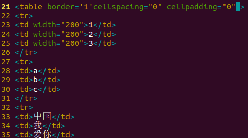 <table border='1'cellspacing="0" cellpadding="0" > <tr> <td width="200">1</td> <td width="200">2</td> <td width="200">3</td> </tr> <tr> <td>a</td> <td>b</td> <td>c</td> </tr> <tr> <td>中国</td> <td>我</td> <td>爱你</td> </tr> </table>