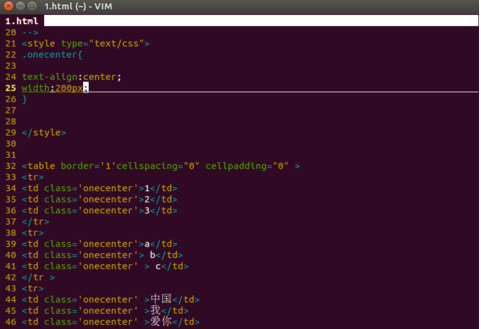 <style type="text/css">.onecenter{text-align:center;width:200px;}</style><table border='1'cellspacing="0" cellpadding="0" > <tr> <td class='onecenter'>1</td> <td class='onecenter'>2</td> <td class='onecenter'>3</td> </tr> <tr> <td class='onecenter'>a</td> <td class='onecenter'> b</td> <td class='onecenter' > c</td> </tr > <tr> <td class='onecenter' >中国</td> <td class='onecenter' >我</td> <td class='onecenter' >爱你</td> </tr> </table>