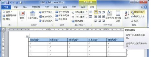 1、将光标放在第一行的任意单元格;(若不在第一行,即拆分表格)