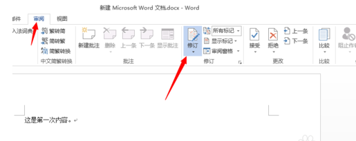 3.点击修订即可开启修订功能。这是我们删除这句话,换为“这是第一次修订。”如图所示。