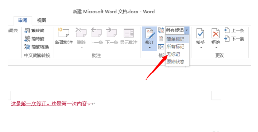 4.也许并不想一直看到以前删除的内容,而是想在想要查阅的时候看到,这是可以在修订旁边的下拉菜单选择“无标记”。这样就不会显示删除的内容了。