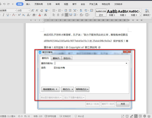 3、复制完成后,不要选中任何内容,按快捷键Ctrl+F弹出”查找和替换。