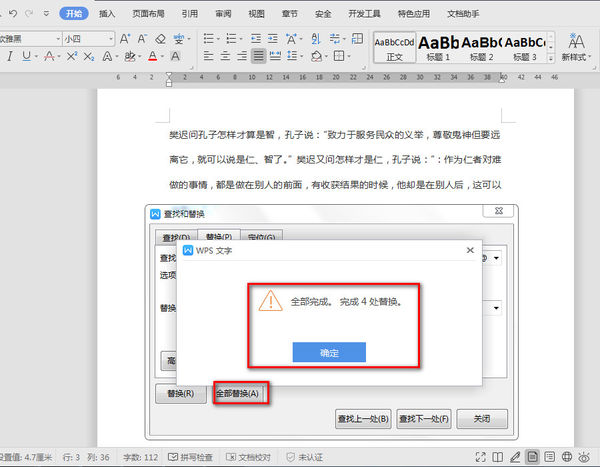 5、输入完成后,点击“全部替换”,替换完成则会弹出替换完成的选项,点击确定后,关闭“查找和替换”。