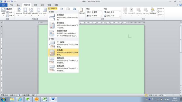 1、将光标定位在第2页末尾处,点击“页面布局——(页面设置)分隔符——(分节符)下一页”