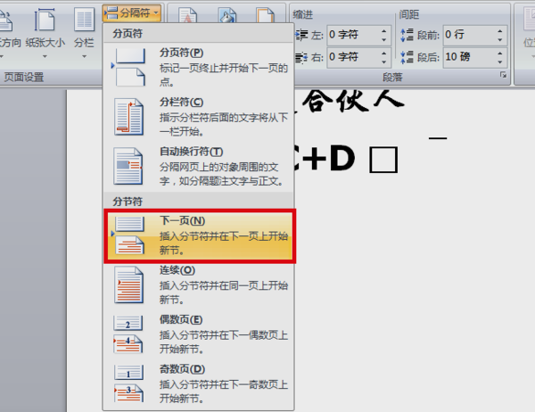 2、选择“插入-分隔符”,打开“分隔符”对话框,在“分隔符类型”下单击选中“下一页”单选钮。