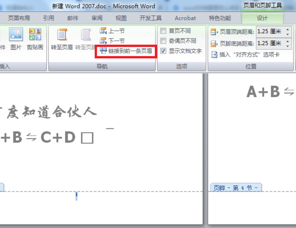4、然后在“设计”的选项页面中确保“链接到前一条页眉”选项未被选中。
