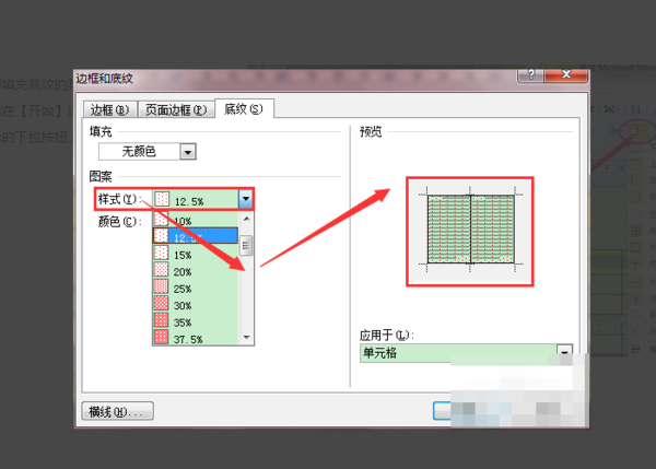 5、设置完底纹颜色,我们来选择想要的底纹,我们点击【样式】的下拉选择框,滚动鼠标中间的滚轮,选择合适的底纹,在有右侧可以预览底纹的样式。