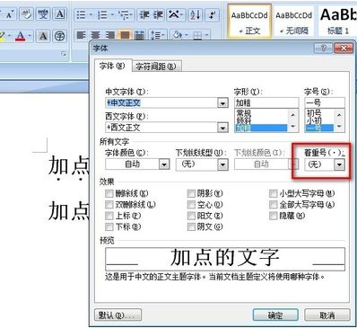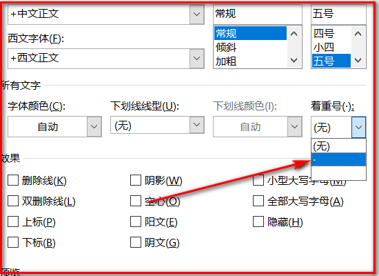 4、在随后打开的文本设置右侧的“着重号”处点击,在随后弹出的下拉菜单中点击“.”即可。