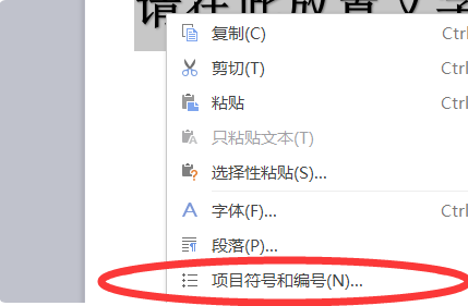 2、选中该文字,点击鼠标右键,在弹出的选项中选择“项目符号和编号”。