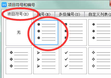 3、然后在弹出的“项目符号和编号”对话框中点击“项目符号”选项,并点击选中第二个图样。