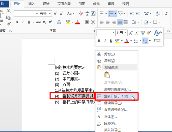 2、如果有,直接选中第(4),右键在弹出的快捷菜单中选择重新开始编号1,排序就会改为从(1)开始。截图如下:
