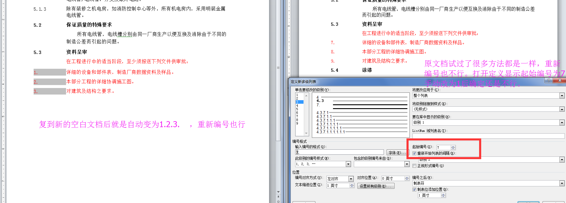 word2010为什么这些编号都不是1开头,而且点重新开始(1)时还是不变怎么回事?