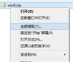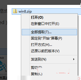 在zip格式的压缩文件上点击右键,选择“全部提取”。如图: