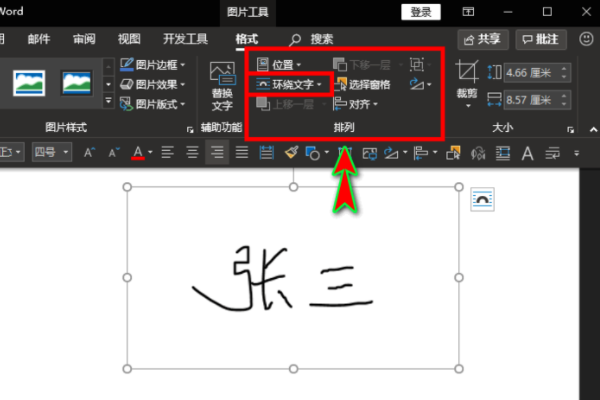 5、插入签名图片后,我们选中图片,在软件顶部菜单栏新出现的“格式”菜单中找到“排列”选项组,在该选项组中找到“环绕文字”选项。