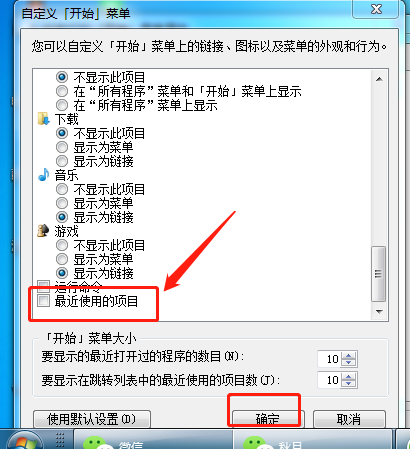 2、在自定义开始菜单中下滑鼠标,找到“最近使用的项目”勾选上,点击确定。