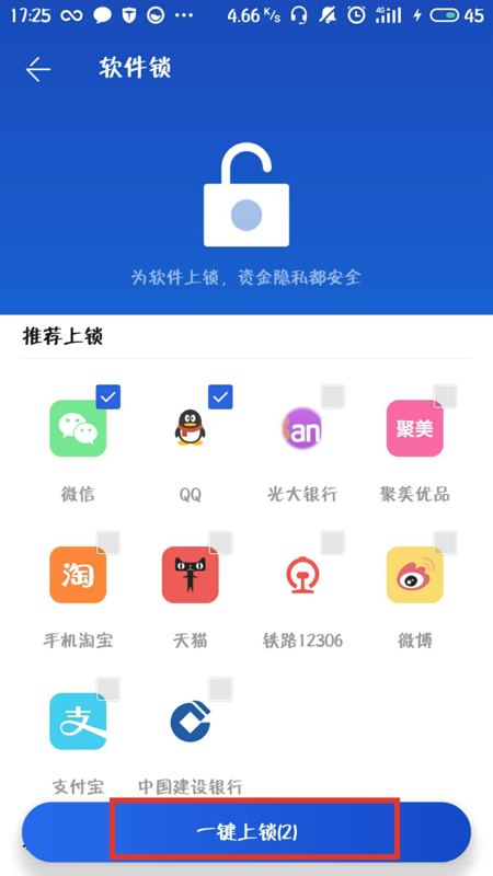 4、然后在"软件锁"页面选择需要进行加密操作的软件,选好后,点击下方的“一键上锁”就可以了。